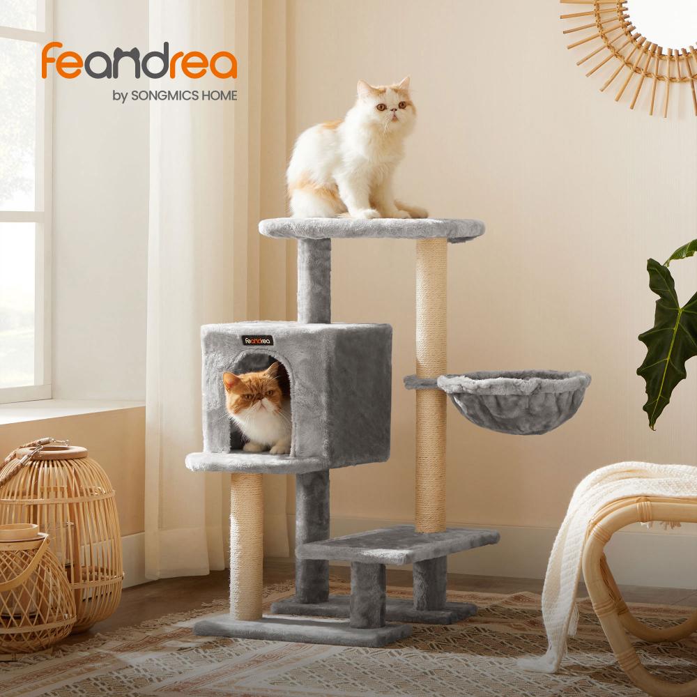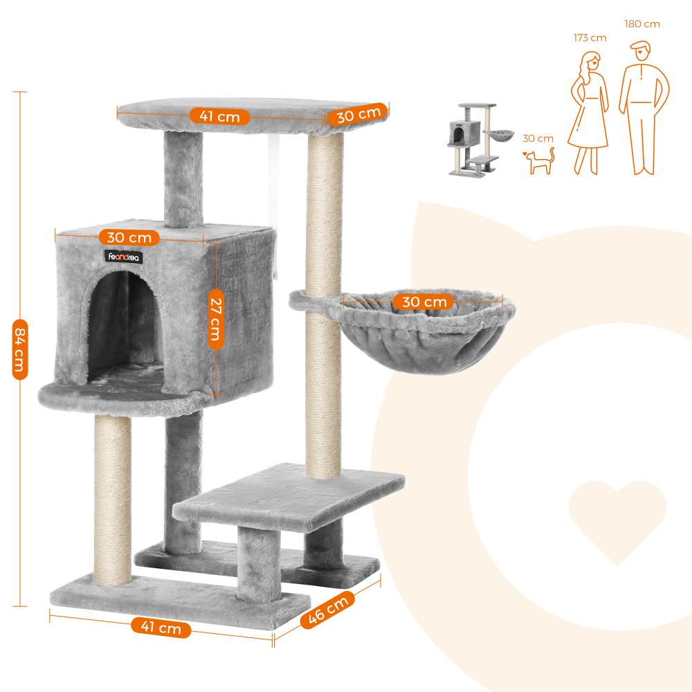 Το FEANDREA PCT142W01 είναι γατόδεντρο ύψους 84 cm σε ανοιχτό γκρι χρώμα, ιδανικό για μικρούς χώρους. Προσφέρει κουκούλα για χαλάρωση, καλάθι για ξεκούραση, πλατφόρμα κορυφής με αφαιρούμενο κάλυμμα και σκαλοπάτια για εύκολη ανάβαση. Οι δύο κορμοί με sisal καλύπτουν τις ανάγκες γρατζουνίσματος, ενώ η στιβαρή βάση εξασφαλίζει σταθερότητα και ασφάλεια.