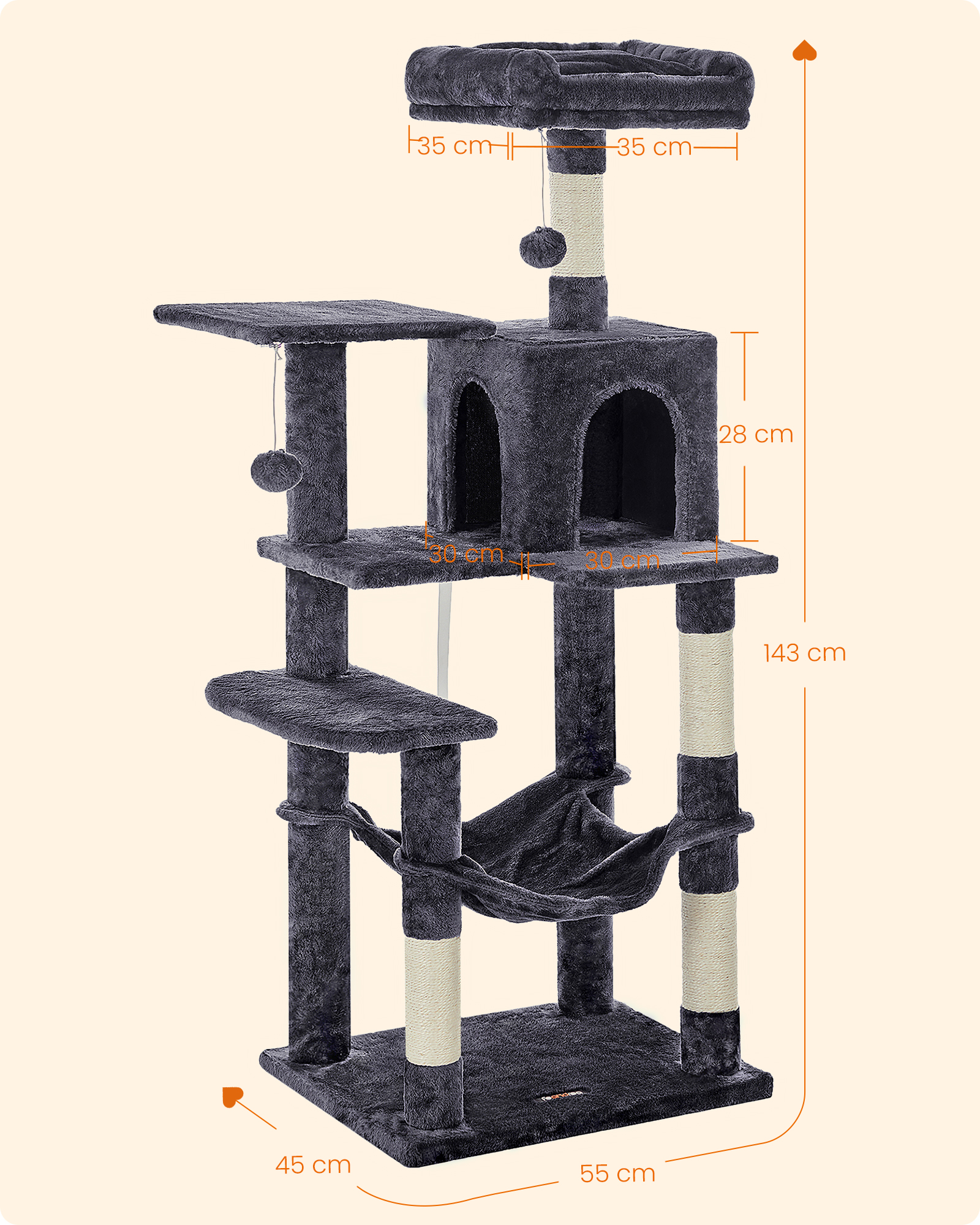 Το Feandrea PCT161G01 είναι ένα γατόδεντρο με 4 σημεία ξυσίματος, σπηλιά, αιώρα και πλατφόρμες, ιδανικό για παιχνίδι, ξεκούραση και αναρρίχηση. Διαθέτει βελούδινη επένδυση για άνεση, ενισχυμένη βάση για σταθερότητα και κιτ αντι-ανατροπής για ασφάλεια. Περιλαμβάνει 2 pom-poms με κουδουνάκια και 2 ανταλλακτικά χωρίς ήχο.