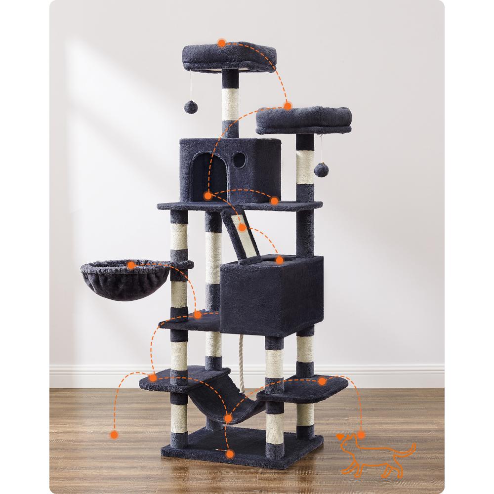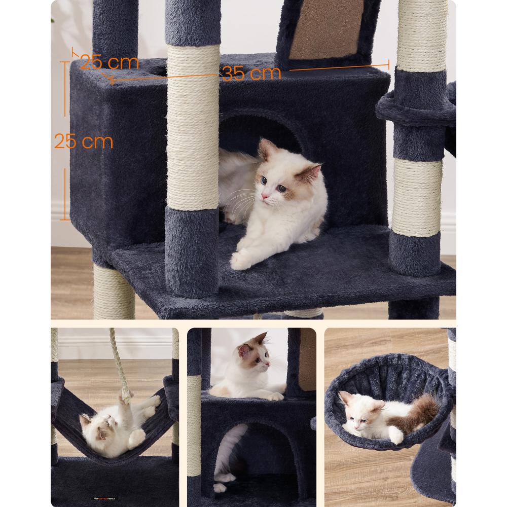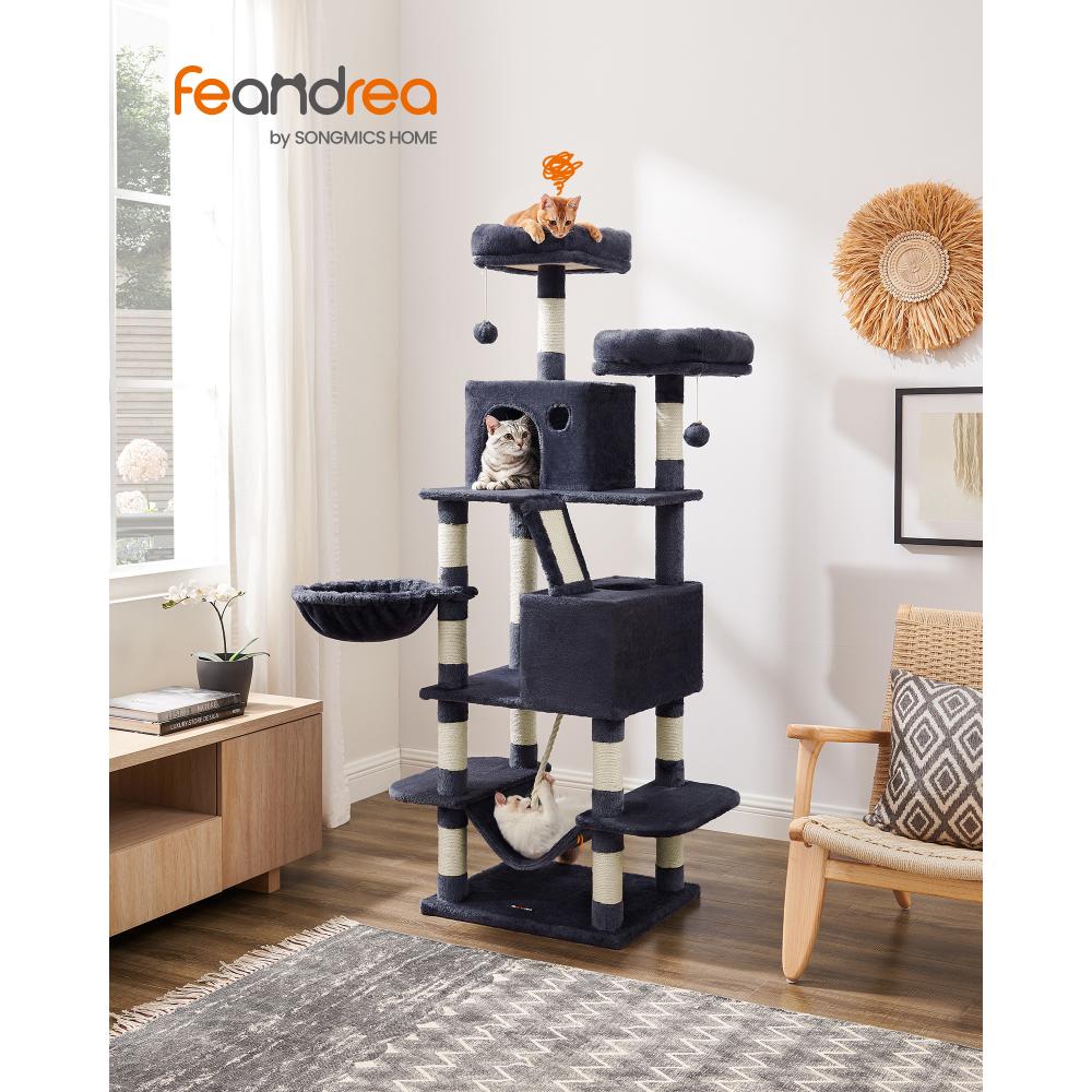 Το FEANDREA PCT165G01 είναι ένα εντυπωσιακό γατόδεντρο ύψους 168 cm σε κομψό γκρι χρώμα, ιδανικό για σπίτια με πολλές γάτες. Προσφέρει άφθονο χώρο για παιχνίδι και χαλάρωση: δύο σπηλιές, καλάθι, αιώρα, πλατφόρμες και μαλακά παιχνίδια. Οι πολλοί κορμοί με sisal καλύπτουν τις ανάγκες γρατζουνίσματος, ενώ η στιβαρή βάση και το κιτ αντι-ανατροπής εξασφαλίζουν μέγιστη ασφάλεια.