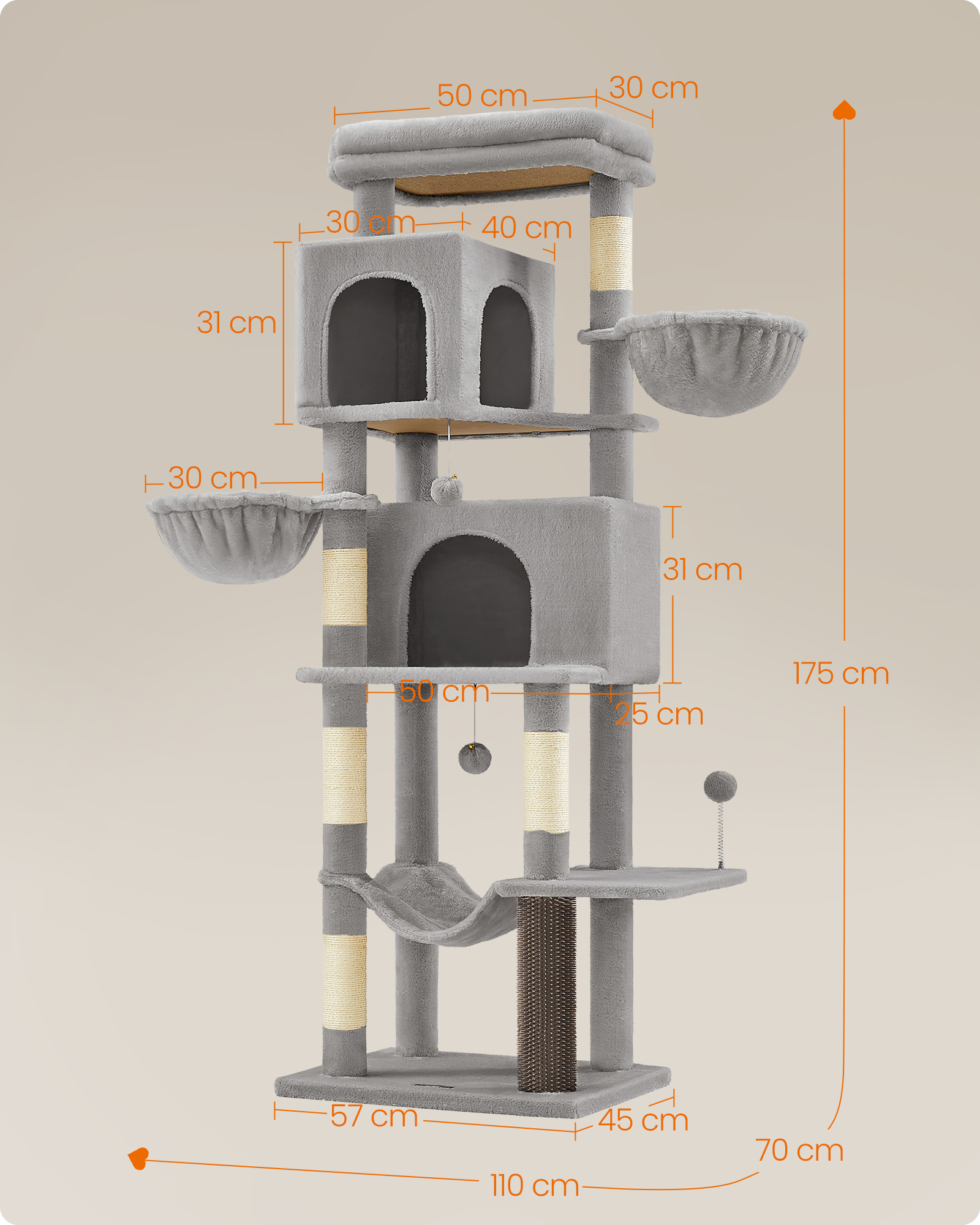 Το Feandrea PCT182G01 είναι ένα πολυτελές δέντρο γάτας ύψους 175 cm, ιδανικό για σπίτια με πολλές γάτες. Προσφέρει πολλαπλά επίπεδα για παιχνίδι, χαλάρωση και ξύσιμο, με σπηλιές, αιώρα, καλάθια και πλατφόρμες. Διαθέτει στήλες με σισάλ για ξύσιμο, βούρτσα αυτο-καλλωπισμού και ανθεκτική κατασκευή με κιτ αντι-ανατροπής για ασφάλεια.