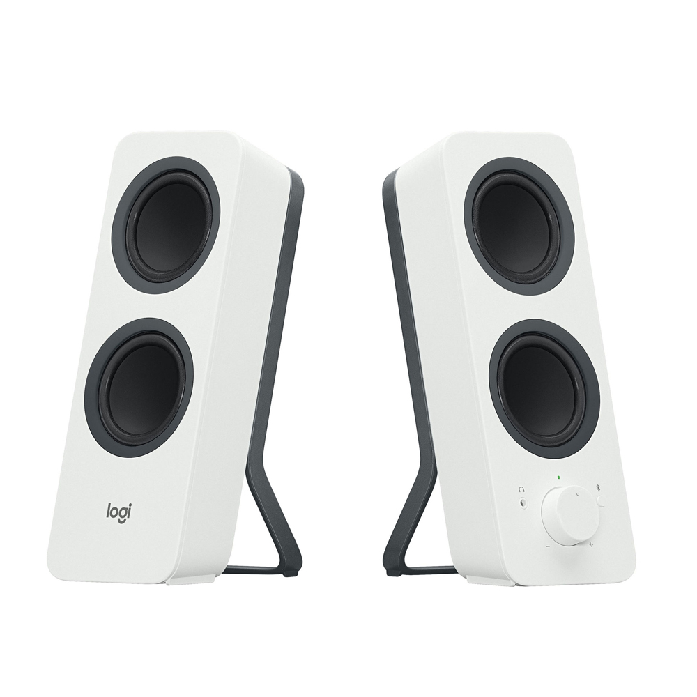 Ηχεία Bluetooth από τη Logitech σε λευκό χρώμα. Μπορούν να συνδεθούν με έως και δύο συσκευές μέσω Bluetooth και μίας μέσω της εισόδου 3,5 mm. Παρέχουν εξαιρετική ποιότητα ήχου και είναι ιδανικά για χρήση στο γραφείο ή στο σπίτι.