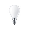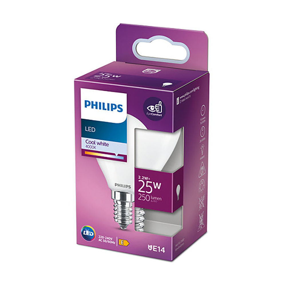 Choose this Philips ball lamp with frosted glass. Due to its shape and size, this lamp is very suitable as an energy-efficient replacement for traditional incandescent lamps. The lamp has a power of 2.2W and fits on a fixture with E14 fitting. The lamp produces a cool white light with a luminous flux of 250 lumens and a color temperature of 4000K. This light meets the requirements of the EyeComfort quality mark, which means that it is a lot more pleasant for the eyes than similar light from other lamps.