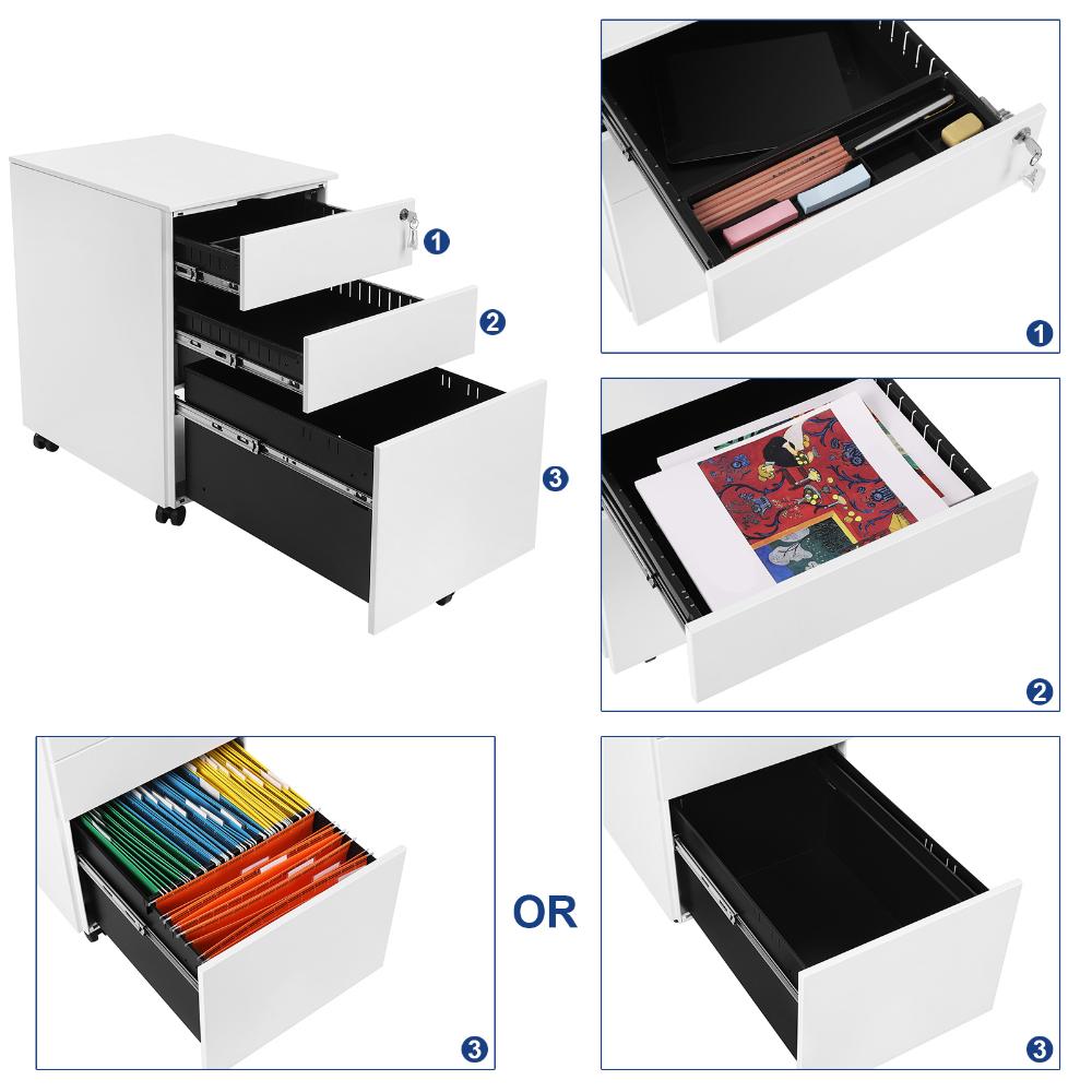 Αυτό το ντουλάπι αρχειοθέτησης είναι κατασκευασμένο από ανθεκτικό ατσάλι, εξασφαλίζοντας υψηλή σταθερότητα – τα 2 επάνω συρτάρια αντέχουν έως 15 kg το καθένα, ενώ το μεγάλο κάτω συρτάρι έως 20 kg.