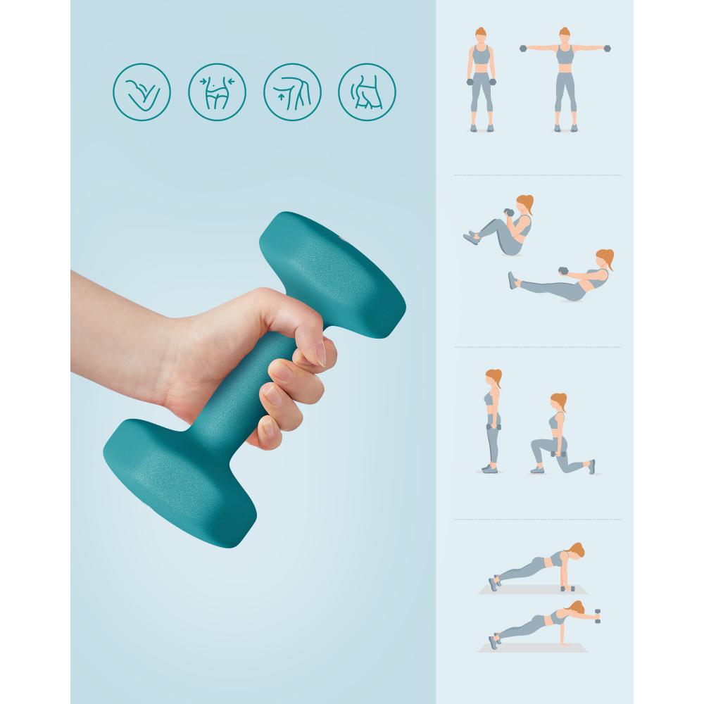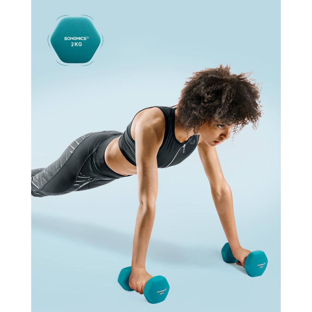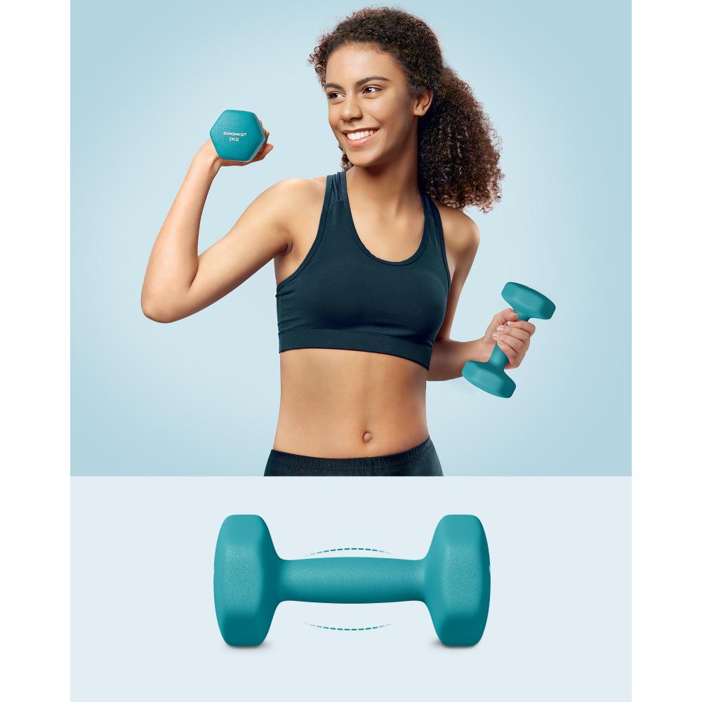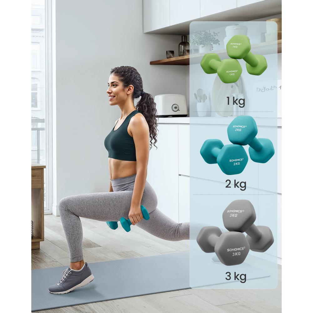 Ανακαλύψτε το SONGMICS Hex Dumbbells Set με Βάση – τον ιδανικό σύμμαχο για την καθημερινή σας προπόνηση στο σπίτι! Το σετ περιλαμβάνει 3 ζεύγη αλτήρων (1 kg, 2 kg, 3 kg) σε μοντέρνα χρώματα Lime, Teal και Light Grey, προσφέροντας ποικιλία βαρών για διαφορετικά επίπεδα άσκησης.