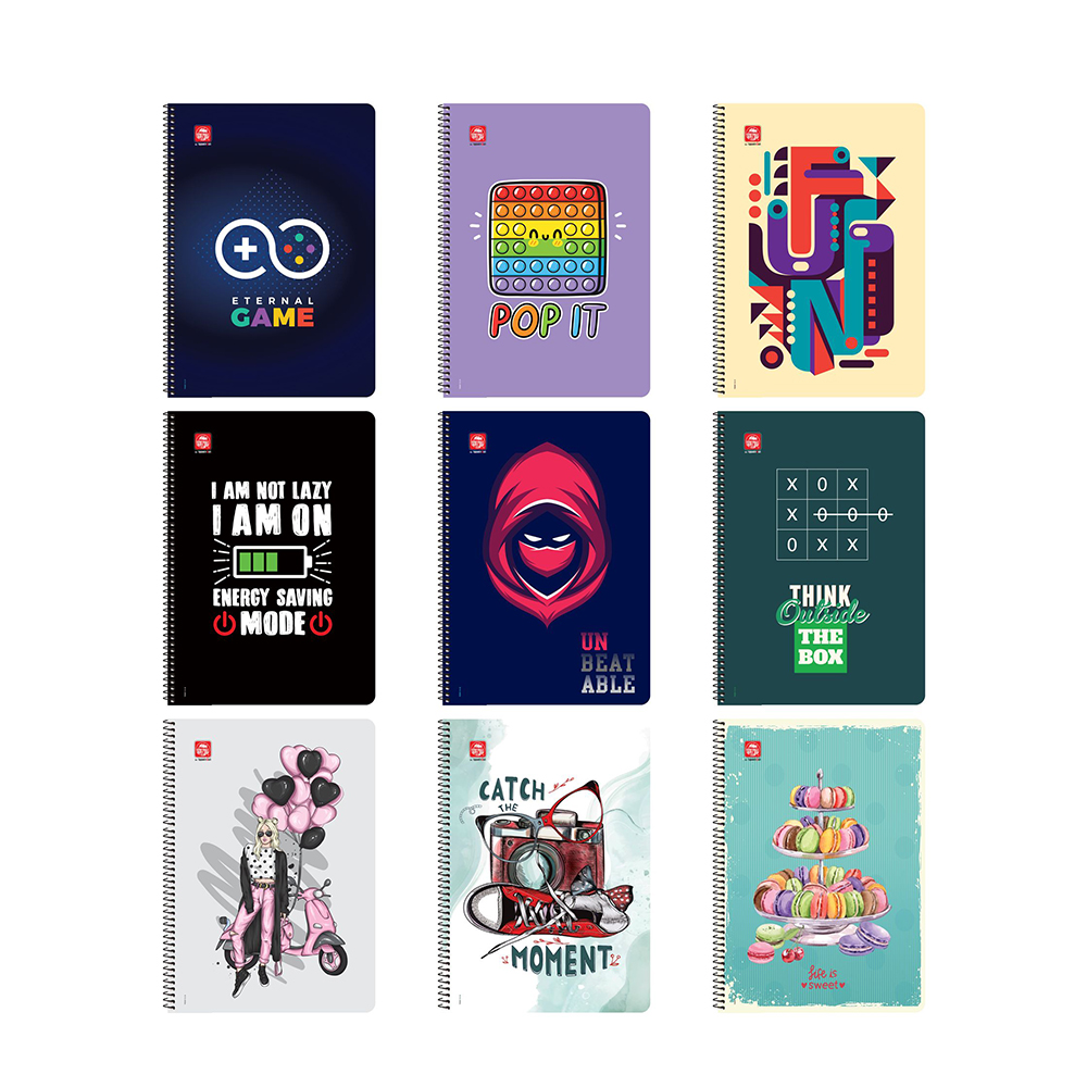 Τετράδιο σπιράλ 3 θεμάτων A4 (21x29,7). Με εξώφυλλο paperboard 350gr. και με σκληρό οπισθόφυλλο για να μπορείς να γράφεις σταθερά. Τα φύλλα είναι από εξαιρετικής ποιότητας χαρτί 70γρ. και η γραμμογράφηση είναι ριγέ. Είναι 3 θεμάτων, με διαχωριστικό για μεγαλύτερη ευκολία. Διατίθεται σε 9 σχέδια, σύμφωνα με τις απαιτήσεις και τις τάσεις της αγοράς. Η συσκευασία είναι ανάμεικτων σχεδίων (τυχαία επιλογή)