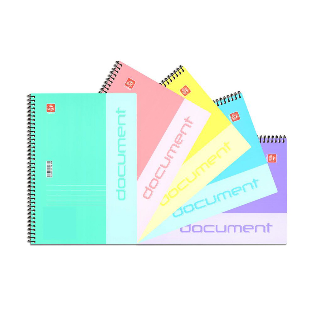 Document τετράδιο σπιράλ 3 θεμάτων A4 (21x29,7). Με εξώφυλλο πλαστικοποιημένο 350 γρ. και με σκληρό οπισθόφυλλο για να μπορείς να γράφεις σταθερά. Τα φύλλα είναι από εξαιρετικής ποιότητας χαρτί 70γρ. και η γραμμογράφηση είναι ριγέ. Είναι 3 θεμάτων, με διαχωριστικό για μεγαλύτερη ευκολία. Διατίθεται σε 5 παστέλ χρώματα (ροζ, κίτρινο, μέντα, μωβ, γαλάζιο).