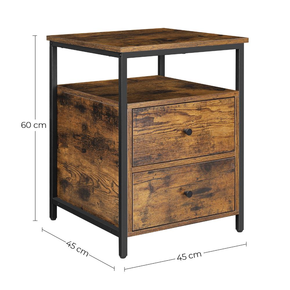Δώστε στον χώρο σας μια κομψή και πρακτική λύση με το VASAGLE Nightstand LET067B01. Ο συνδυασμός rustic brown και μαύρου μεταλλικού σκελετού προσφέρει μια industrial αισθητική που ταιριάζει σε κάθε υπνοδωμάτιο ή σαλόνι. Με ανοιχτό ράφι και δύο ευρύχωρα συρτάρια, εξασφαλίζει άνετη αποθήκευση για βιβλία, αξεσουάρ και προσωπικά αντικείμενα, ενώ η στιβαρή κατασκευή του εγγυάται μακροχρόνια χρήση.