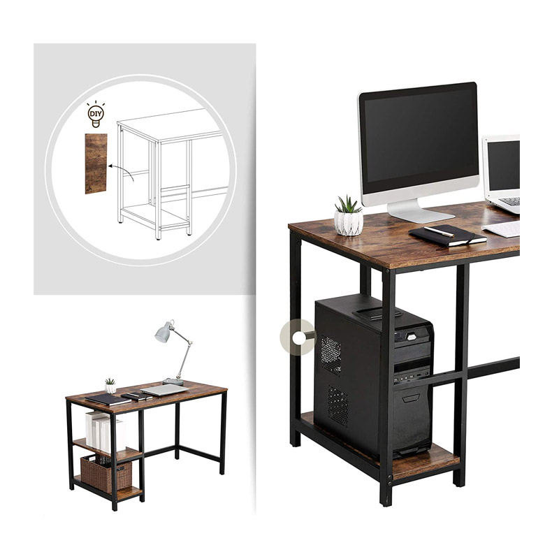 Το γραφείο, από την εταιρία VASAGLE, διαθέτει μεταλλικό σκελετό και επιφάνεια από μοριοσανίδες σε ρουστίκ καφέ απόχρωση. Είναι αρκετά μεγάλο για να χωρέσει έναν υπολογιστή, εκτυπωτή, βιβλία, ακόμη και λίγο χώρο για φυτά σε γλάστρες. Έχει 2 πλαϊνά ράφια τα οποία μπορούν να τοποθετηθούν είτε στη δεξιά είτε στη αριστερή πλευρά του γραφείου. Επιπλέον το ένα ράφι μπορεί να αφαιρεθεί ώστε να τοποθετήσετε με άνεση τον πύργο του υπολογιστή σας. Έχει άφθονο χώρο για τα πόδια σας, ενώ μπορεί να χωρέσει εύκολα την καρέκλα από κάτω.