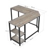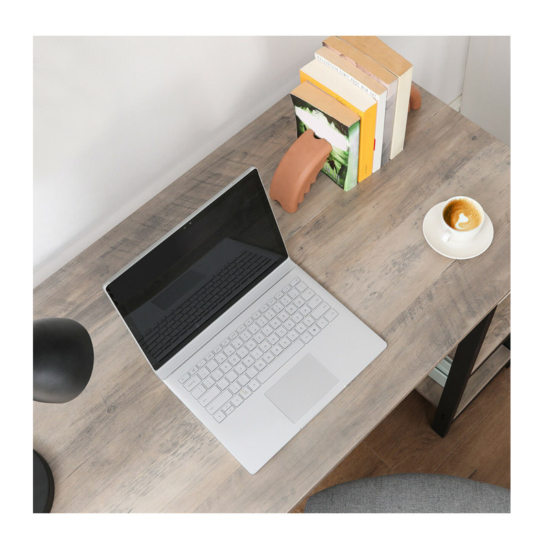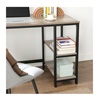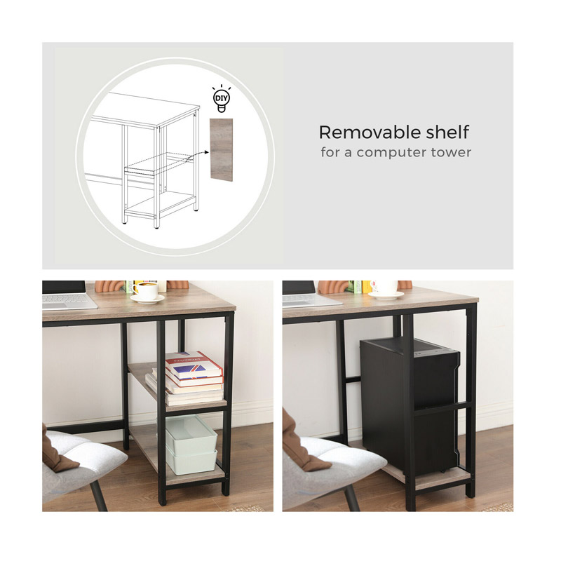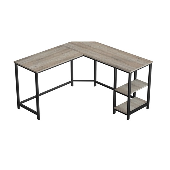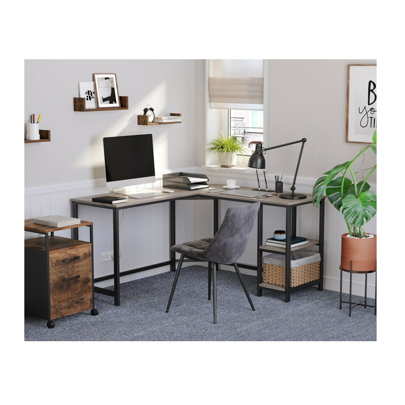 Το γωνιακό γραφείο σε σχήμα L, από την εταιρία VASAGLE, διαθέτει ατσάλινο πλαίσιο και επιφάνεια από μοριοσανίδες σε ρουστίκ καφέ φινίρισμα. Στο κάτω μέρος διαθέτει 2 ράφια, με το πάνω ράφι αφαιρούμενο για να δημιουργηθεί χώρος για έναν πύργο υπολογιστή.