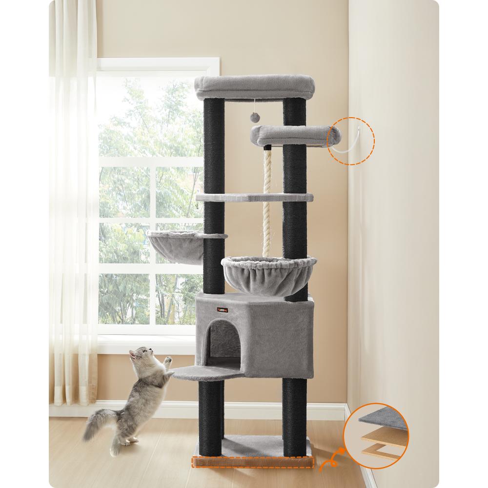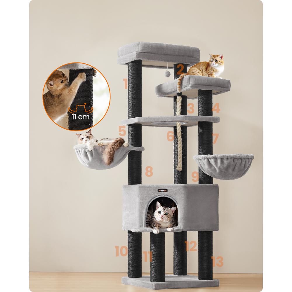 Χαρίστε στο γάτο σας τον απόλυτο χώρο παιχνιδιού με το Feandrea XXL Cat Tree PCT008G02. Με ύψος 186,7 cm και στιβαρή κατασκευή, προσφέρει πολλαπλά επίπεδα για σκαρφάλωμα, ξύσιμο και ξεκούραση. Οι χοντροί στύλοι με σχοινί sisal 11 cm εξασφαλίζουν αντοχή για μεγάλες φυλές όπως Maine Coons. Κομψός συνδυασμός Dove Grey & Ink Black για κάθε χώρο.