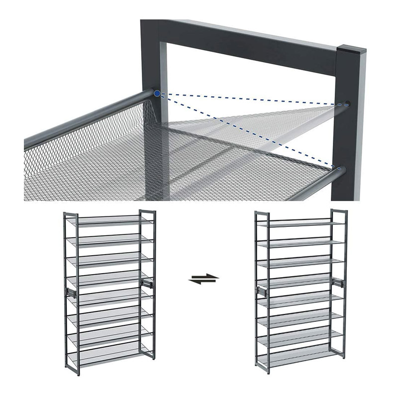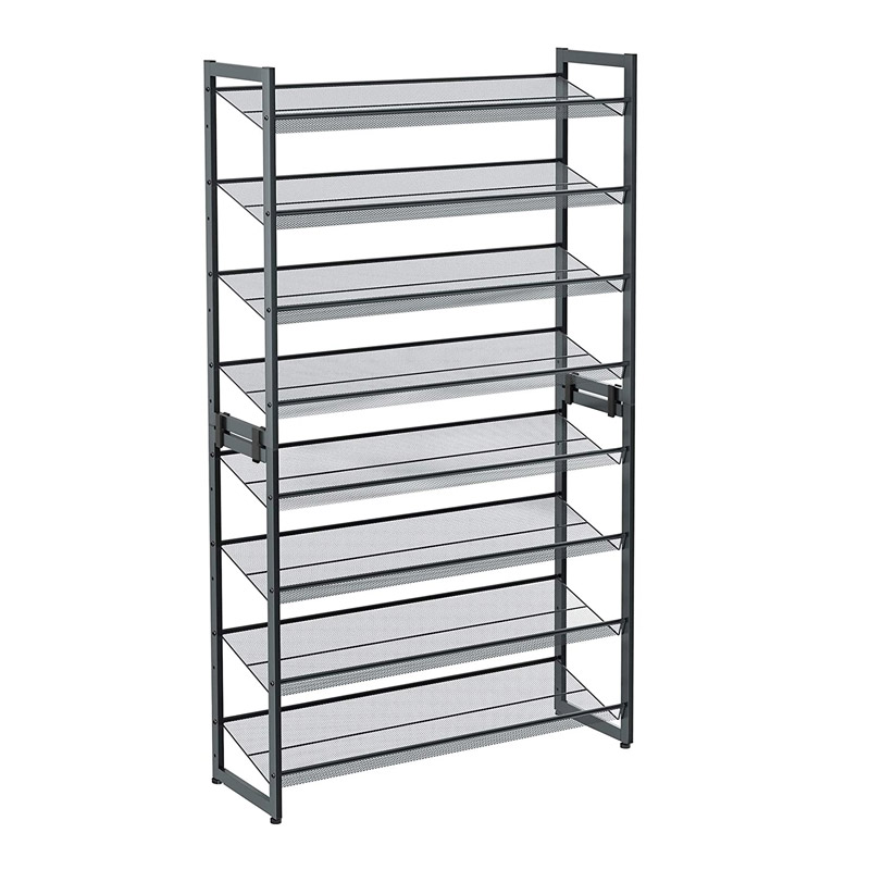 Το stand αποθήκευσης παπουτσιών, από την εταιρία Songmics, θα σας βοηθήσει να έχετε πάντα τακτοποιημένα και καθαρά τα παπούτσια σας. Διαθέτει 8 ράφια, υψηλής ποιότητας, με βάση σε μορφή μεταλλικού πλέγματος για τον επαρκή αερισμό των παπουτσιών σας. Τα ράφια είναι ρυθμιζόμενα και μπορούν να είναι σε κεκλιμένη ή επίπεδη μορφή, ανάλογα με το είδος των παπουτσιών που θέλετε να τοποθετήσετε. Οι σωλήνες έχουν λεία επιφάνεια και είναι ανθεκτικοί στη διάβρωση και στη φθορά. Εύκολο στη φροντίδα, απλά το καθαρίζετε με ένα υγρό πανί.