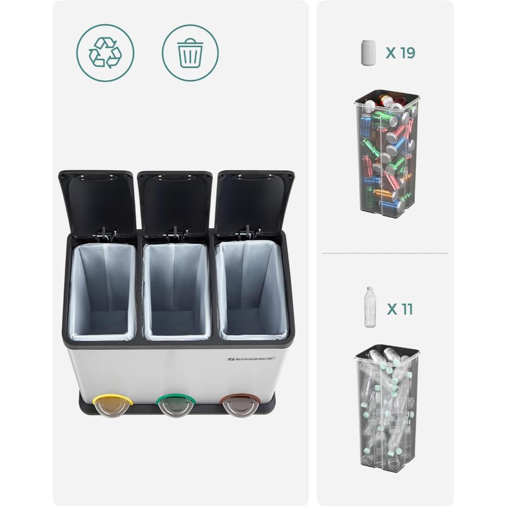 Ο κάδος SONGMICS LTB45L προσφέρει πρακτική λύση για διαχωρισμό απορριμμάτων στην κουζίνα σας. Με τρία ξεχωριστά δοχεία των 15 λίτρων, ανοξείδωτη κατασκευή και πεντάλ για κάθε τμήμα, εξασφαλίζει υγιεινή χρήση χωρίς χέρια και άψογη οργάνωση.