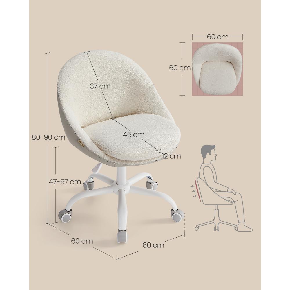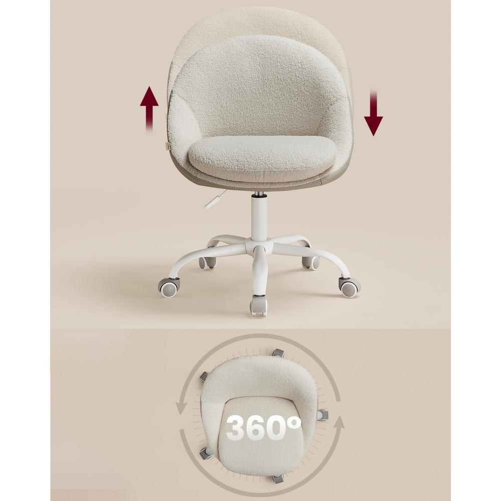 Η SONGMICS OBG020W01 είναι μια κομψή και ευέλικτη καρέκλα γραφείου που συνδυάζει μινιμαλιστικό σχεδιασμό με υψηλή άνεση. Με επένδυση από ύφασμα τύπου Sherpa και PU, προσφέρει απαλή αίσθηση και μοντέρνα εμφάνιση σε αποχρώσεις cappuccino beige και cloud white.
