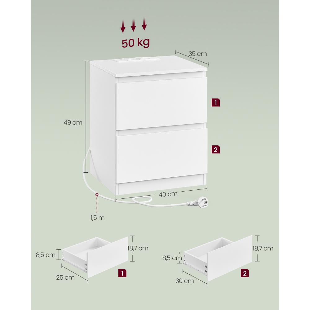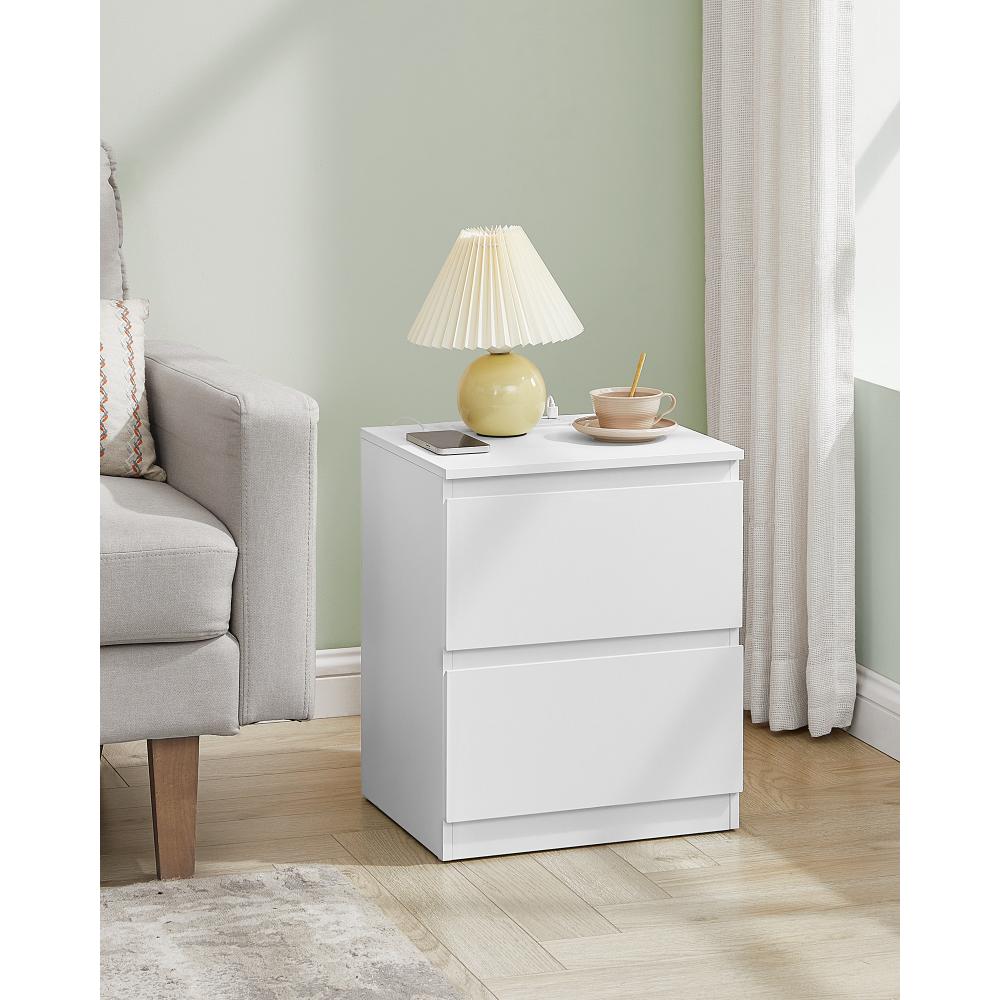 Το VASAGLE LET821W02 είναι ένα μοντέρνο και πρακτικό κομοδίνο που συνδυάζει μίνιμαλ αισθητική και υψηλή λειτουργικότητα. Με ενσωματωμένη πρίζα ρεύματος, θύρες USB και δύο ευρύχωρα συρτάρια, σου επιτρέπει να φορτίζεις τις συσκευές σου άμεσα δίπλα στο κρεβάτι, ενώ παράλληλα διατηρείς τα προσωπικά αντικείμενα οργανωμένα και προστατευμένα. Η κομψή λευκή απόχρωση και οι καθαρές γραμμές του το κάνουν ιδανική επιλογή για κάθε σύγχρονο υπνοδωμάτιο ή χώρο καθιστικού.
