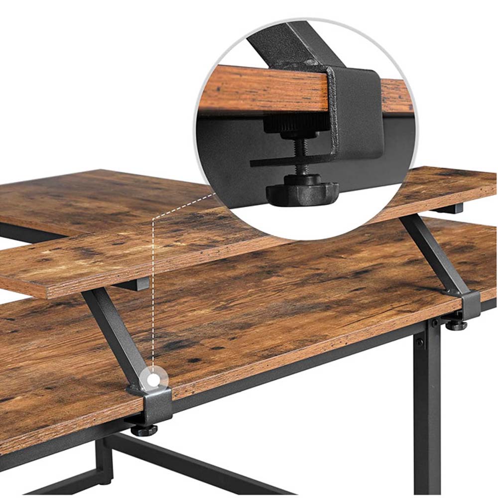 Το γωνιακό γραφείο, από την εταιρία VASAGLE, έχει βιομηχανικό σχεδιασμό σε σχήμα L και ταιριάζει σε κάθε γωνία για εξοικονόμηση χώρου. Διαθέτει σταθερό ατσάλινο πλαίσιο (3 x 3 cm πάχος) και επιφάνεια από μοριοσανίδες σε ρουστίκ σκούρη καφέ απόχρωση με μέγιστο βάρος τα 50 Kg. Έχει πρακτική βάση οθόνης 20 x 90 cm που μπορεί να τοποθετηθεί οπουδήποτε κατά μήκος της άκρης του, ενώ τα ρυθμιζόμενα πόδια του διευκολύνουν την αντιστάθμιση μικρών παρατυπιών στο πάτωμα και το προστατεύουν από γρατζουνιές και βαθουλώματα.